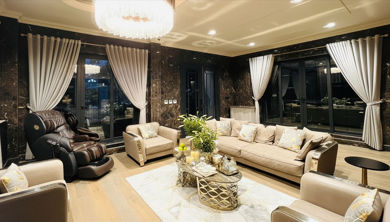 - Phòng khách: Chiếm trọn 120 m², trần cao 6 m, ốp phào PU vẽ tay họa tiết lá nguyệt quế. Bộ sofa da nâu bóng nhập Ý hơn 600 triệu đồng đặt tại trung tâm, đối diện lò sưởi décor – chi tiết rất “châu Âu” hiếm thấy ở Hà Nội. Tông màu kem – nâu – vàng kim tạo cảm giác ấm, sang.