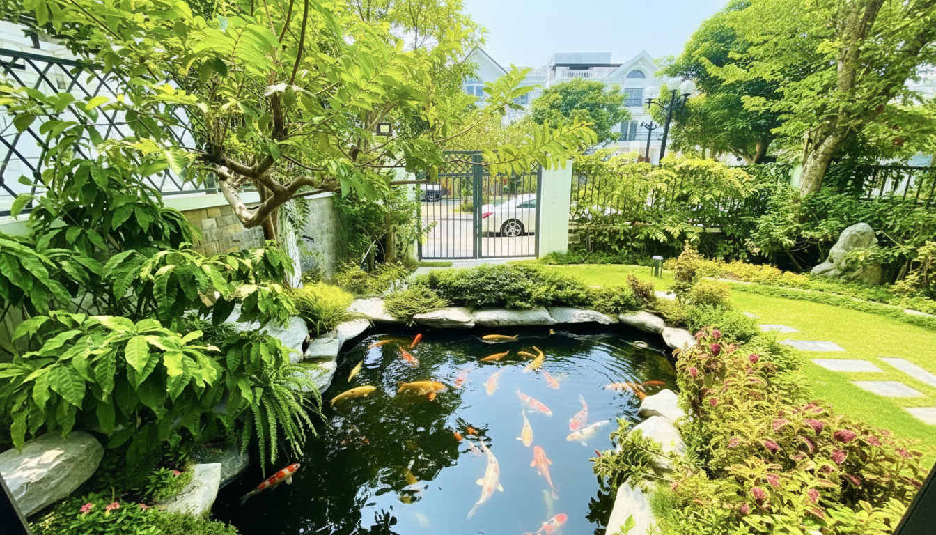 Điểm nhấn cảnh quan chính là hồ cá Koi 40 m², sâu 1,5 m, nuôi gần 30 chú cá Nhật đủ màu, trị giá khoảng 800 triệu đồng. Quanh hồ, kiến trúc sư thiết kế lối đi đá dẹt kiểu stepping stone, đan xen thảm cỏ zoysia. Cây tùng la hán, phong lá đỏ và anh đào nhập khẩu xen lẫn hoa giấy, hồng cổ Sapa – ngôi nhà ngập sắc hương bốn mùa. Chính chủ thường ngồi ghế mây bên hồ thưởng trà, đọc kịch bản. Không gian vừa sang trọng vừa gần gũi thiên nhiên, đúng tinh thần “resort tại gia”.