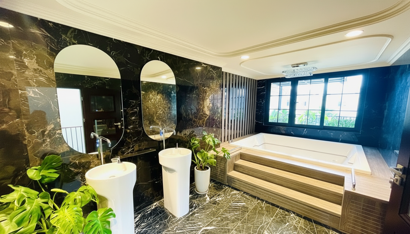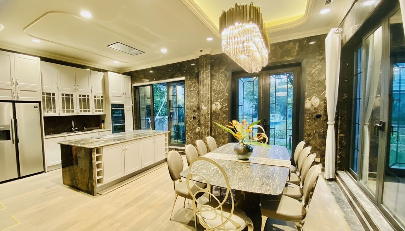 Sau khi ký hợp đồng mua mảnh đất, Lã Thanh Huyền không vội xây ngay. Cô dành gần sáu tháng lên concept, chọn vật liệu, đặt hàng nội thất từ Ý, Tây Ban Nha, Đức. Hệ thống cửa gỗ óc chó, đá marble trắng Hy Lạp, đèn chùm pha lê Czech đều phải chờ lịch sản xuất riêng. Một năm tiếp theo, gia chủ cùng chồng túc trực công trường, chỉnh từng đường phào chỉ, thậm chí nghiên cứu độ cao thềm cửa để thuận tiện cho cao gót của phái đẹp. Tận tay chăm chút khiến căn nhà phản chiếu chuẩn gu thẩm mỹ của nữ diễn viên.